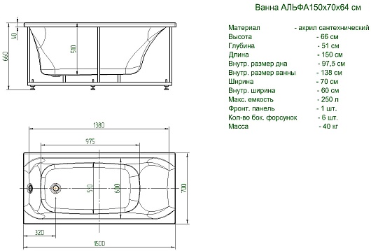 Комплектация: ванна, каркас, слив-перелив, фронтальный экран.