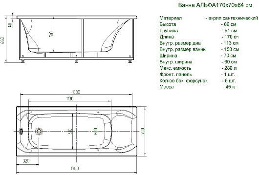 Акриловая ванна Aquatek Альфа 170x70 L - арт. ALF170-0000047.