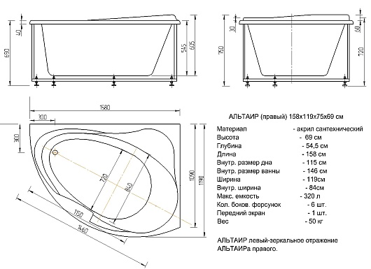 Aquatek Акриловая ванна Альтаир 160x120 L с экраном