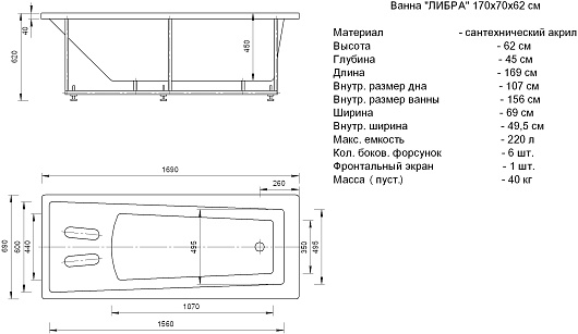 Акриловая ванна Aquatek Либра 170x70 L с экраном - арт. LIB170-0000021.