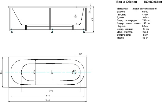 Комплектация: ванна, каркас, фронтальная панель, слив-перелив.