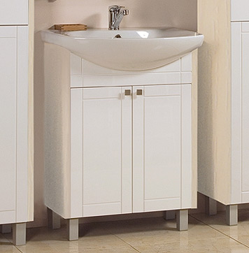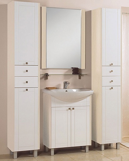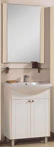 Комплектация: две распашные дверцы, отделение с регулируемой по высоте полкой, фаянсовая раковина «Балтика-65», корпус и фасады нежного молочного оттенка, хромированая фурнитура.