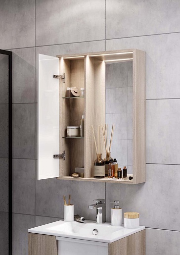 - В верхнюю панель зеркального шкафа интегрирована LED-подсветка.