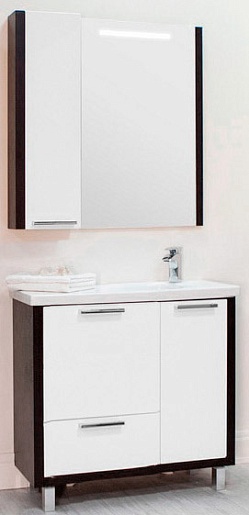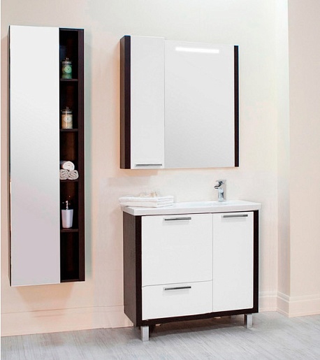 Описание: подвесной шкаф с зеркалом для ванной. Слева шкафчик с полками. Зеркало оснащено встроенным галогеновым светильником и выключателем. Дверца шкафа на доводчиках. Корпус ЛДСП, толщина боковых стенок 38 мм, фасад МДФ.