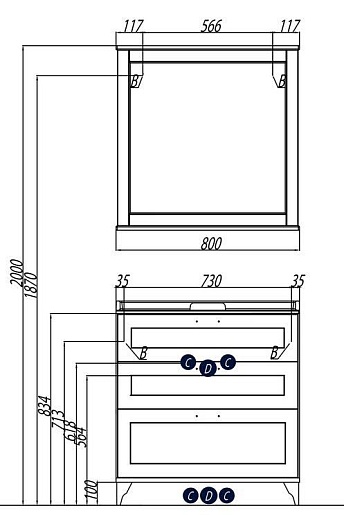 Комплектация: усиленный подвесной кронштейн - 2, ящик с интегрированными доводчиками - 3, ручка (керамика, бронза) - 2, декоративная ножка - 2, раковина "Фабиа 800" (арт. 1A708031FB010) - 1. Покрытие - пленка мембранно-вакуумного прессование с фактурой дерева. Подключение к канализации - заднее или нижнее.
