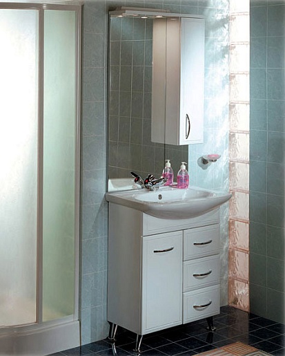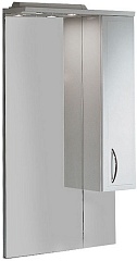 Комплектация: влагостойкое зеркальное полотно, справа закрытый шкафчик с распашной дверцей и двумя полочками. В карниз встроены два галогеновых светильника с автономным выключателем и розетка.