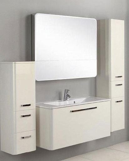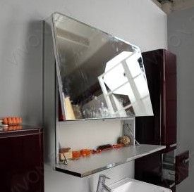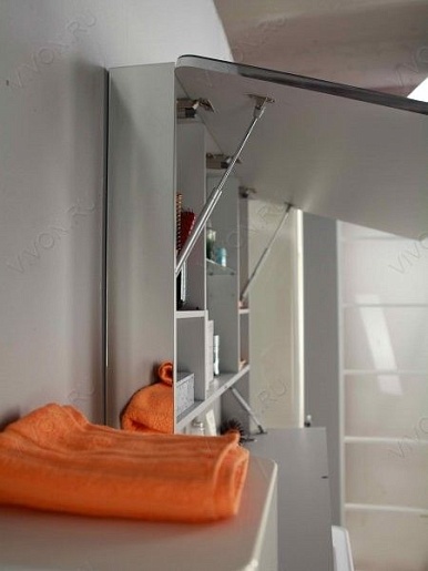 Описание: влагостойкая, зеркальная, откидная дверца оборудована газо-масляными подъемниками для плавного и бесшумного открывания, зеркальное полотно со встроенной подсветкой, выключателем и розеткой. Внутреннее пространство имеет три полочки из закаленного стекла и систему хранения. Боковые стенки шкафа также зеркальные, с хромированой глянцевой кромкой.