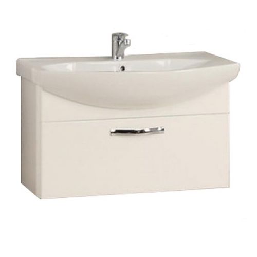 Комплектация: глубокий выдвижной ящик с системой хранения. Корпус из глянцевого ЛДСП, фасады — МДФ (глянец), хромированая фурнитура, фаянсовая раковина "Смайл 80". Усиленные навесы входят в комплект.