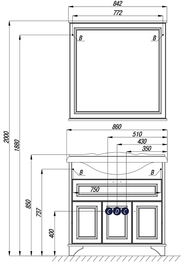 - тумба под раковину: распашные дверцы с доводчиками, выдвижной ящик с органайзером, внутренние полки, ручки от итальянского производителя BOSETI MORELLA