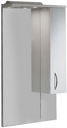 Комплектация: влагостойкое зеркальное полотно, справа закрытый шкафчик с распашной дверцей и двумя полочками. В карниз встроены два галогеновых светильника с автономным выключателем и розетка.