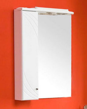 Комплектация: влагостойкое зеркальное полотно, слева закрытый шкафчик с изящной фрезеровкой на фасаде распашной дверцы и полочкой. В карниз встроены галогеновые светильники с автономным выключателем и розетка.