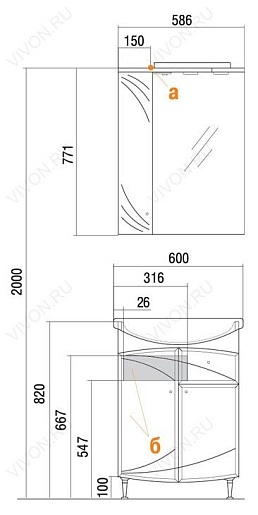 Комплектация: влагостойкое зеркальное полотно, справа закрытый шкафчик с изящной фрезеровкой на фасаде распашной дверцы и полочкой. В карниз встроены галогеновые светильники с автономным выключателем и розетка.