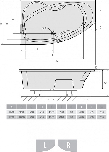 Акриловая ванна Mamba 170 R, арт. 77111