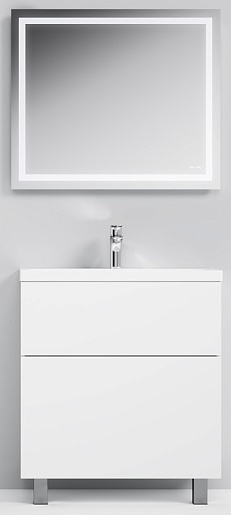 База под раковину устанавливается на пол, в конструкции тумбочки имеются два ящика с нажимным механизмом открывания («push-to-open»). Нижний, более вместительный ящик рассчитан на крупные вещи (комплекты одежды, сменное бельё, полотенца), верхний имеет несколько отделений. Раковина изготовлена из керамики, белого глянцевого цвета. Удобное зеркало прямоугольной формы оборудовано светодиодной лентой по всему периметру, благодаря чему в тёмное время суток можно не включать верхнее освещение.Состав комплекта :