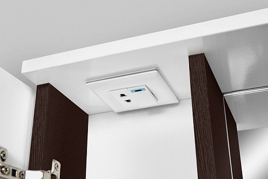 Описание: влагостойкое зеркальное полотно, шкафчик, полочка, выключатель, розетка, дверь с доводчиками, подсветка.