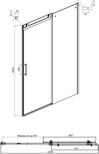 - Дверь: одна раздвижная дверь, одно неподвижное стекло.