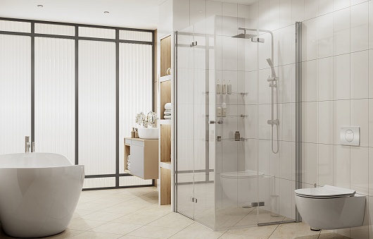 - квадратное душевое ограждение с распашными и складывающимися наружу и вовнутрь дверьми