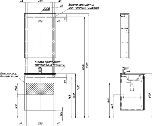 Комплектация: тумба, раковина, зеркальный шкаф, комплект креплений.