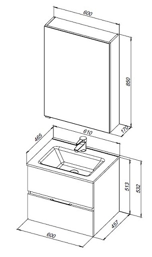 Комплектация: тумба, раковина, зеркальный шкаф, комплект креплений.