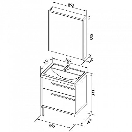 Описание: влагостойкое зеркальное полотно, шкафчик, полочка, светильник приобретается отдельно.Тумба с раковиной Фостер 70