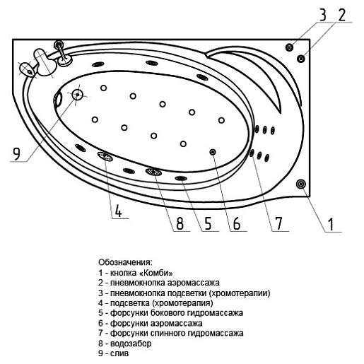 Комплектация: ванна, каркас, фронтальный экран, гидромассажная система (6 форсунок), слив-перелив.