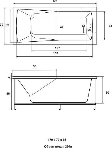 Комплектация: ванна, каркас, слив-перелив, гидромассаж (пневматическое управление, 6 форсунок).