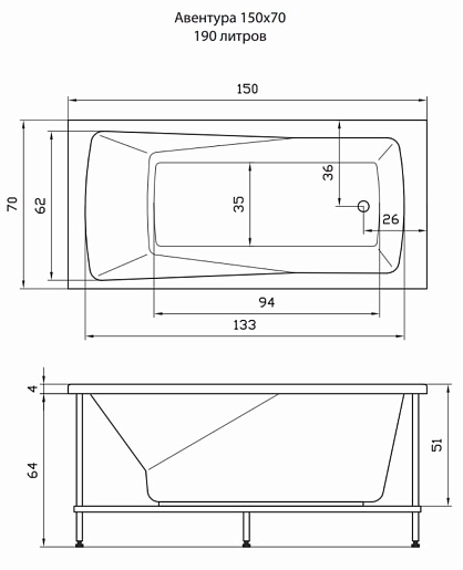 Aquatika Акриловая ванна H2O Авентура Standart 150x70 cм