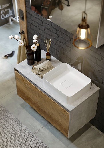 Описание: Коллекция Mobi гармонично вписывается в интерьер любой современной ванной комнаты. Так как существует возможность комбинировать фасады и корпуса трех цветов: бетон светлый, дуб балтийский и белый глянец. Подходит любой наставной умывальник. При этом умывальник может устанавливаться в любом месте, а не только центру.