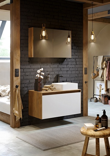 Описание: Коллекция Mobi гармонично вписывается в интерьер любой современной ванной комнаты. Так как существует возможность комбинировать фасады и корпуса трех цветов: бетон светлый, дуб балтийский и белый глянец. Подходит любой наставной умывальник. При этом умывальник может устанавливаться в любом месте, а не только центру.