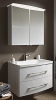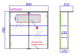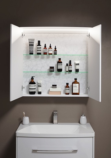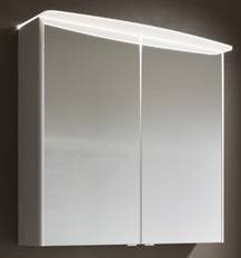 Описание: Зеркальный шкаф с двумя дверьми, светодиодным светильником, также освещающим внутреннее пространство, сенсорным выключателем и регулятором освещенности.