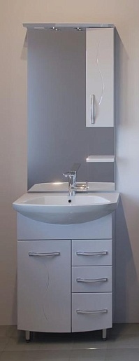 Описание: напольная тумба с тремя выдвижными ящиками и распашной дверью. Доводчики обеспечивают комфортное закрывание. Комбинированные ручки белый/хром имеют удобную для открывания форму. В комплект входит мебельная раковина Балтика 60 (Санитек)