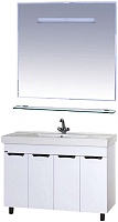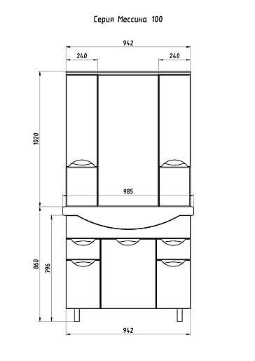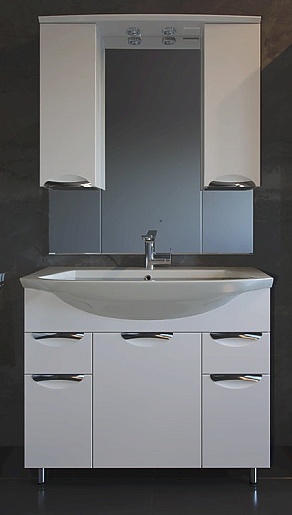Описание: влагостойкое зеркальное полотно, два шкафчика с распашной дверцей с доводчиками, полочка, встроенные в карниз светильники, розетка и выключатель.