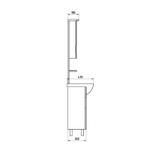 Описание: влагостойкое зеркальное полотно, справа шкафчик с распашной дверцей с доводчиками, полочка, встроенные в карниз светильники, розетка и выключатель.