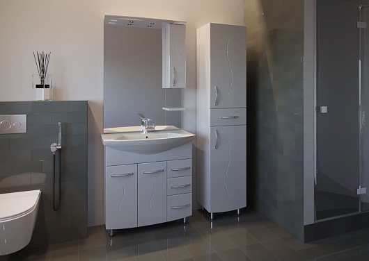 Описание: напольная тумба с тремя выдвижными ящиками и двумя дверцами. Доводчики обеспечивают комфортное закрывание. Комбинированные ручки белый/хром имеют удобную для открывания форму. В комплект входит мебельная раковина Балтика 80 (Санитек)