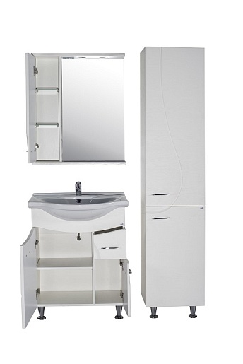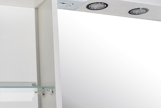 Комплектация: Зеркало с открытой полкой и шкафчиком, внутри шкафчика 2 полочки, встроенные в карниз светильники, розетка и выключатель. Белая структурная пленка с фактурой дерева.
