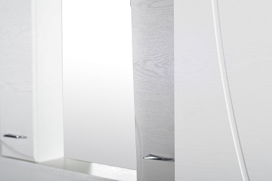 Комплектация: Зеркало с открытой полкой и шкафчиком, внутри шкафчика 2 полочки, встроенные в карниз светильники, розетка и выключатель. Белая структурная пленка с фактурой дерева.