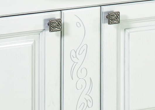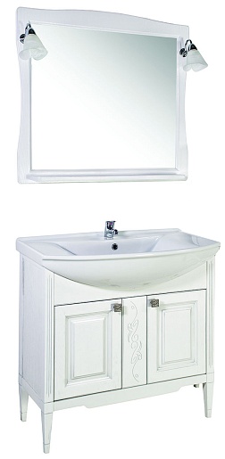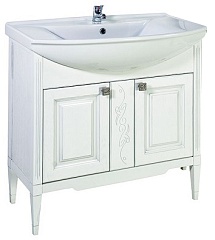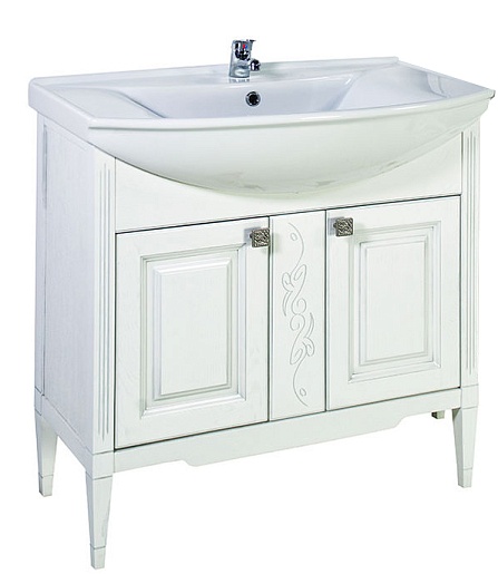 Цвет: белый с серебряной патинойОписание: напольная тумба из массива ясеня, с двумя распашными фасадами на доводчиках, раковина керамическая Стиль 85 Kirovit, фурнитура европейского производства.