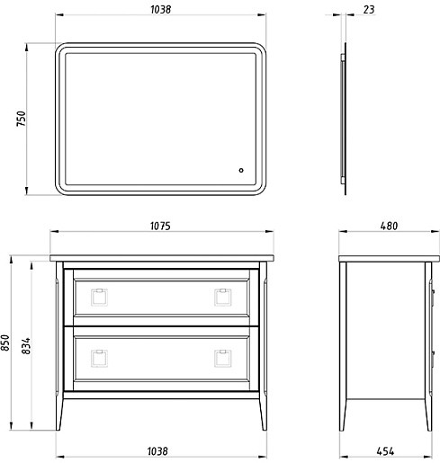 Комплектация: тумба под раковину, ножка (4 шт.), зеркало.