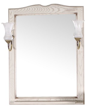 Описание: влагостойкое зеркальное полотно в изысканной раме из массива ясеня, полочка, два светильника.