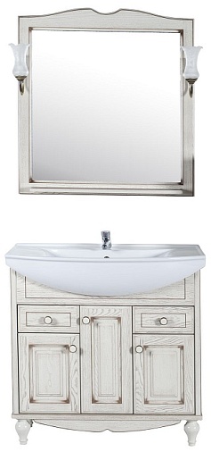 Описание: влагостойкое зеркальное полотно в изысканной раме из массива ясеня, полочка, два светильника.