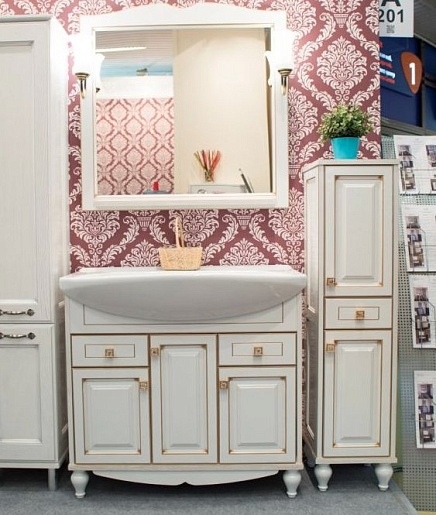 Описание: влагостойкое зеркальное полотно в изысканной раме из массива ясеня, полочка, два светильника.