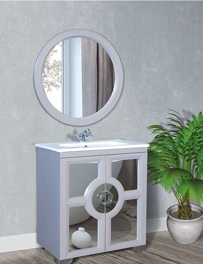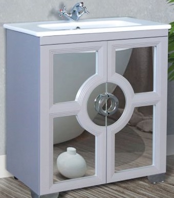 - Тумба под раковину Бишо: два распашных фасада с вставками из зеркала.
