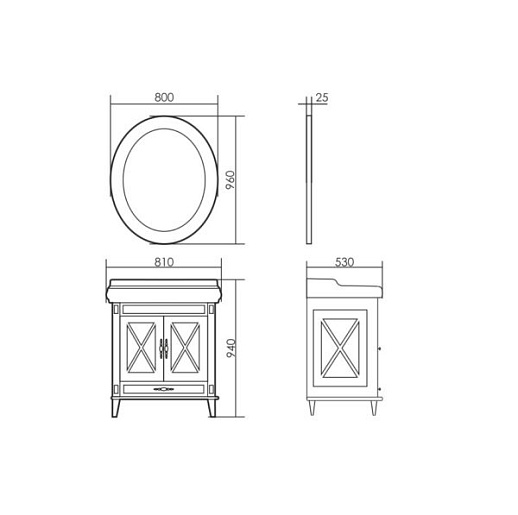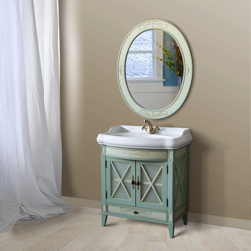 - Тумба под раковину Ретро 80: распашные фасады и боковины тумбы выполнены в виде витрины с перекрестиями, за которыми установлено матовое стекло.