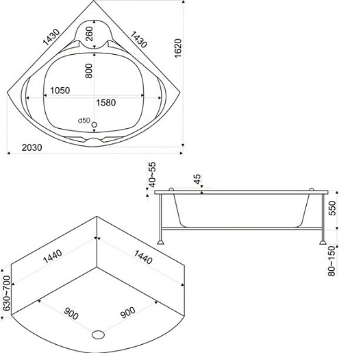 Комплектация: ванна, гидромассажная система, каркас с регулируемыми ножками, крепеж к стене.