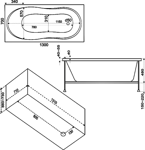Комплектация: ванна, гидромассажная система, каркас с регулируемыми ножками, крепеж к стене.