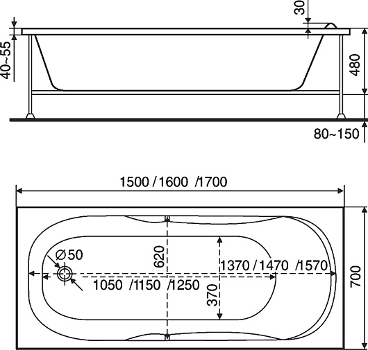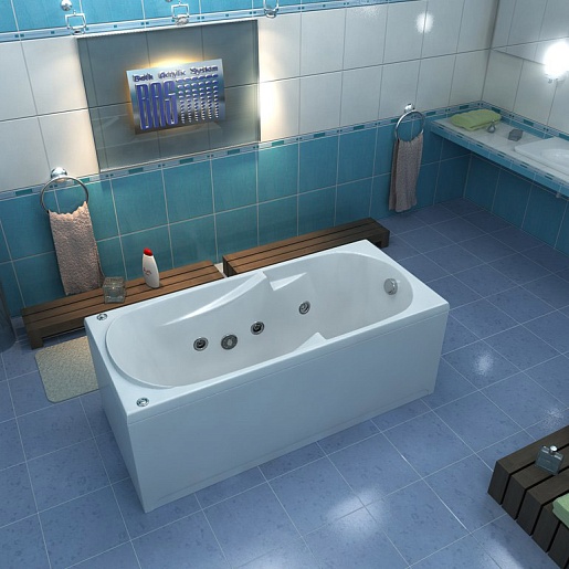 Комплектация: ванна, гидромассажная система, каркас с регулируемыми ножками, крепеж к стене.