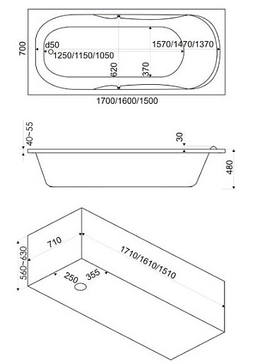 Конструкция ванны предполагает опциональное присоединение фронтального экрана, ручки, слива-перелива со стандартным отверстием, подголовника, каркаса или ножек.