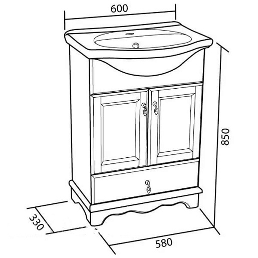 - Тумба с раковиной: раковина Миа 60 (Делла), тумба с дверцами, ящик, крашеные фасады из натурального бука, боковины из ламинированного ЛДСП, петли с доводчиками.