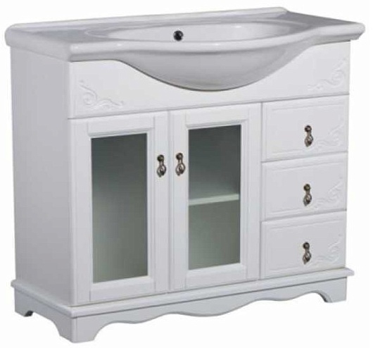 - тумба под раковину: 2 распашных дверцы, 3 ящика, вкладные полки, резные ножки, комплект доводчиков, вставки стекло.