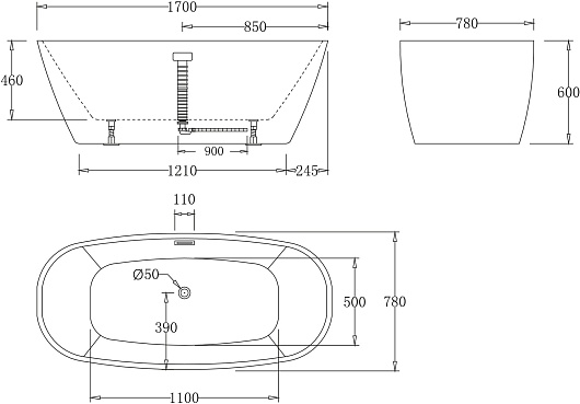 В комплекте: ванна, слив-перелив (хром), ножки.